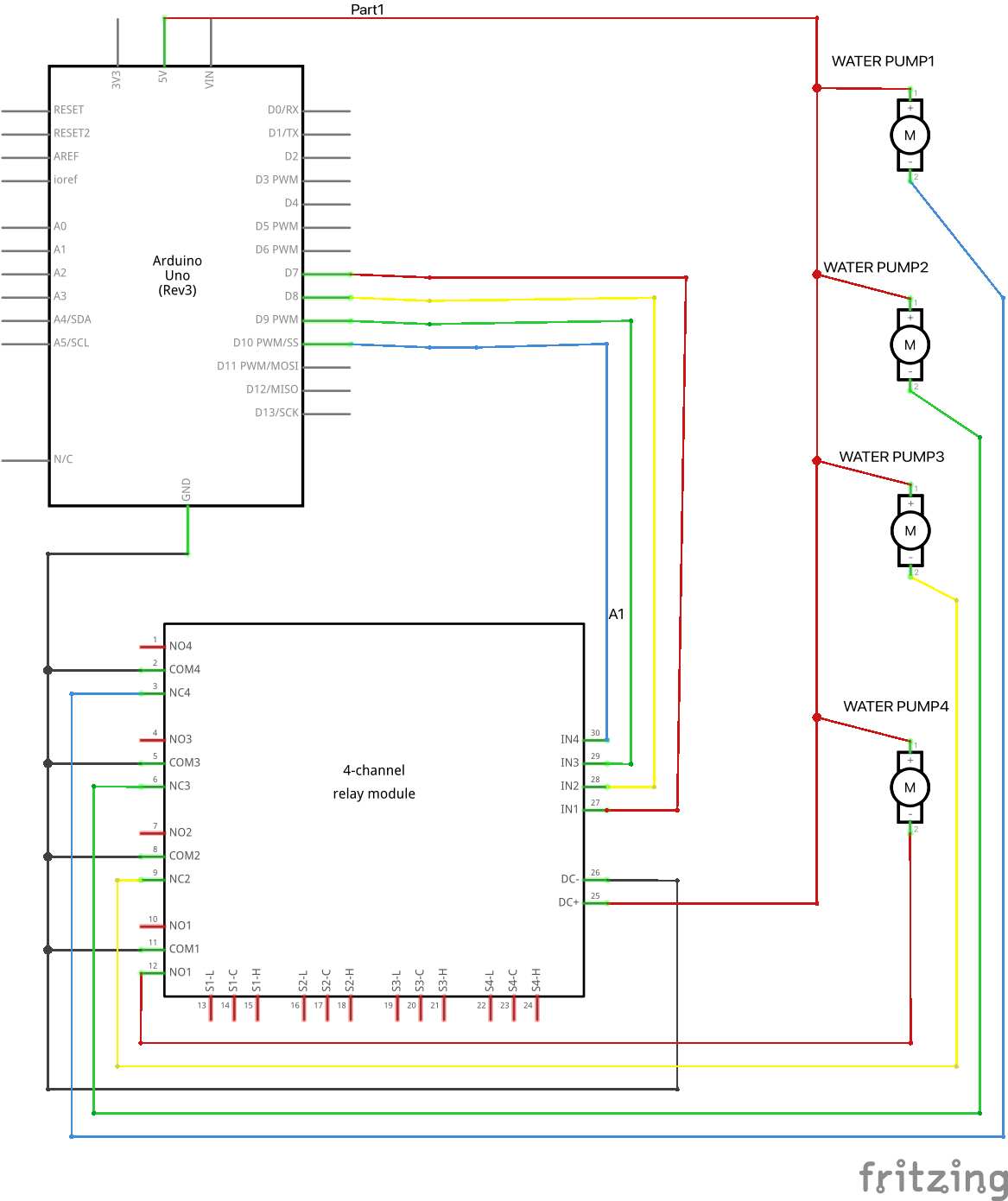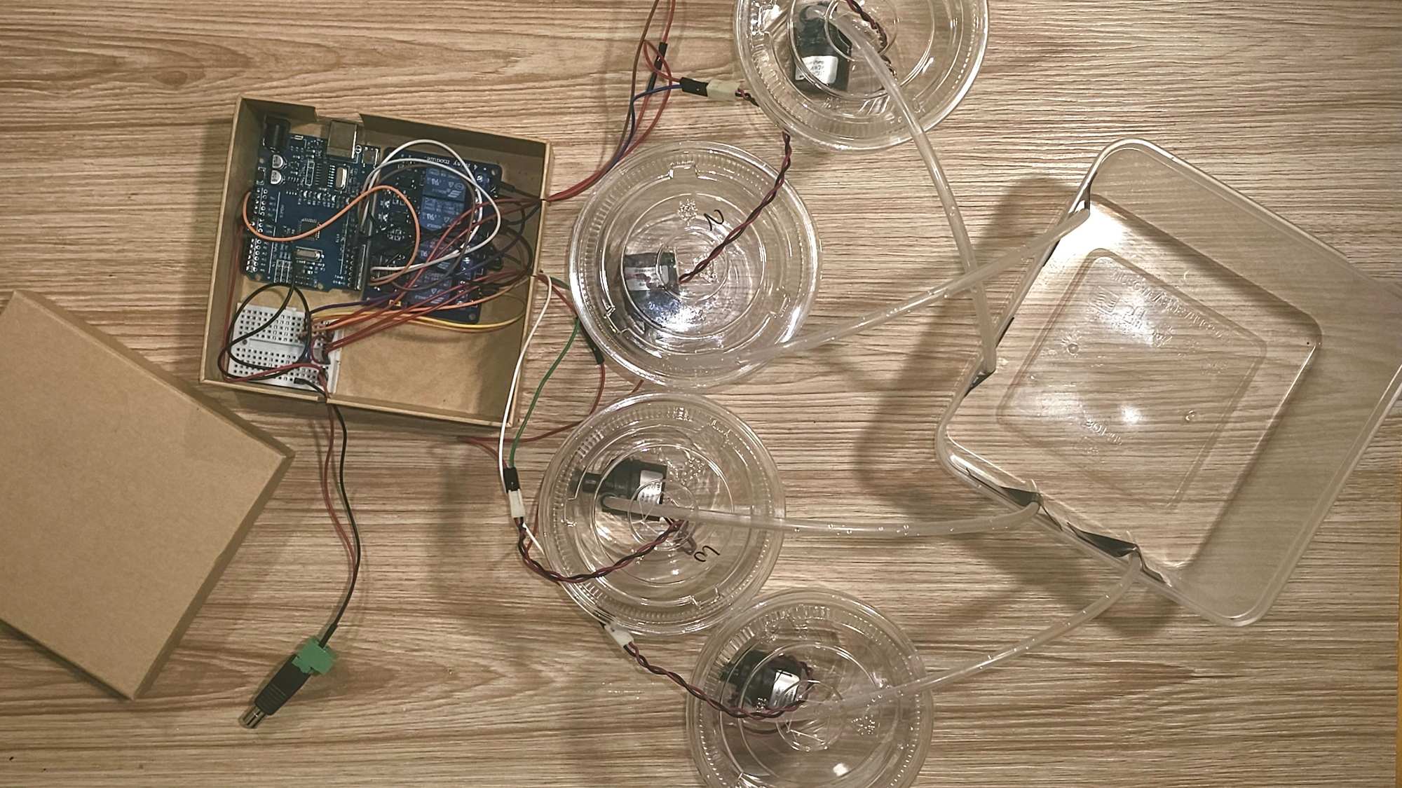 For the full system setup, I connected the ground of each pump to the relay module, with their positive lines connected to a shared 12V power supply on the breadboard. I used Arduino's digital pins to control each relay channel. To prevent unintentional dripping, I kept the paint level in each bucket below the hose end. This ensured that the paint dripped only in response to EEG signals.