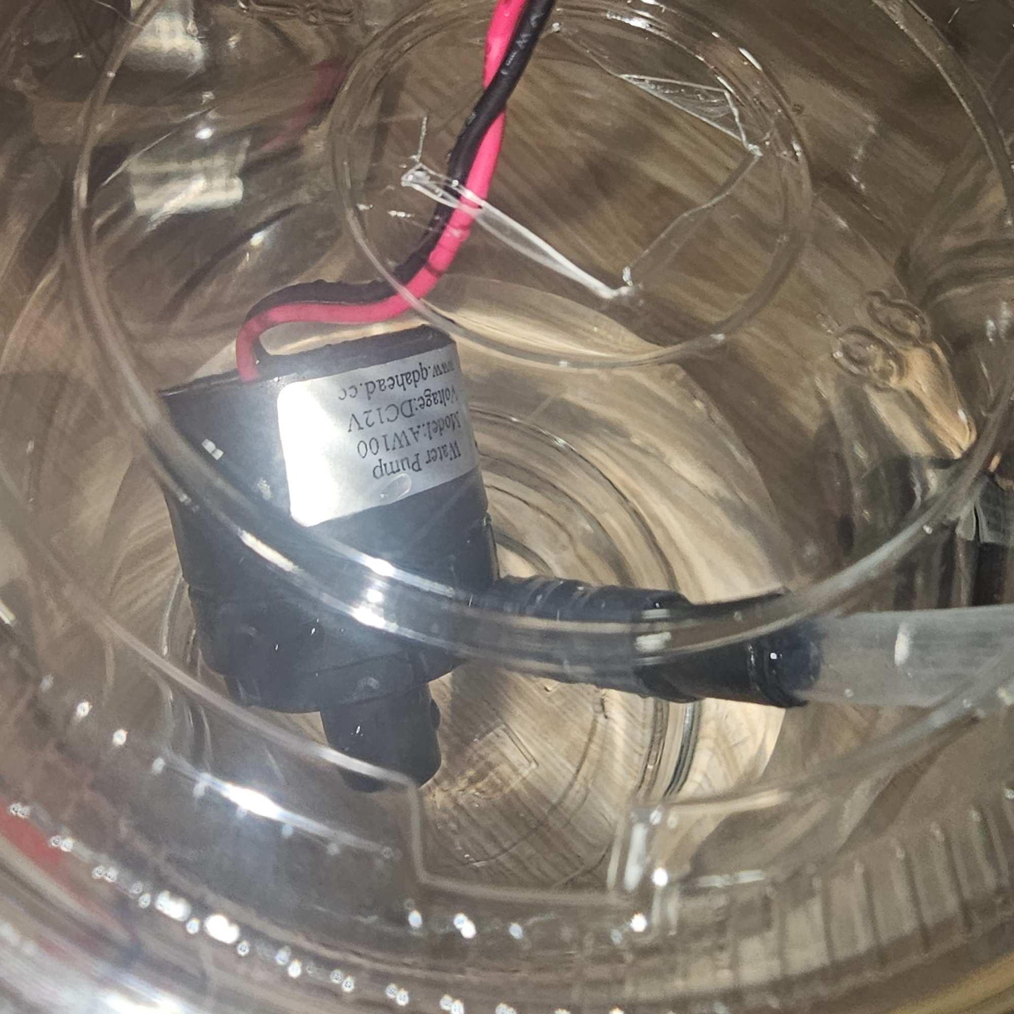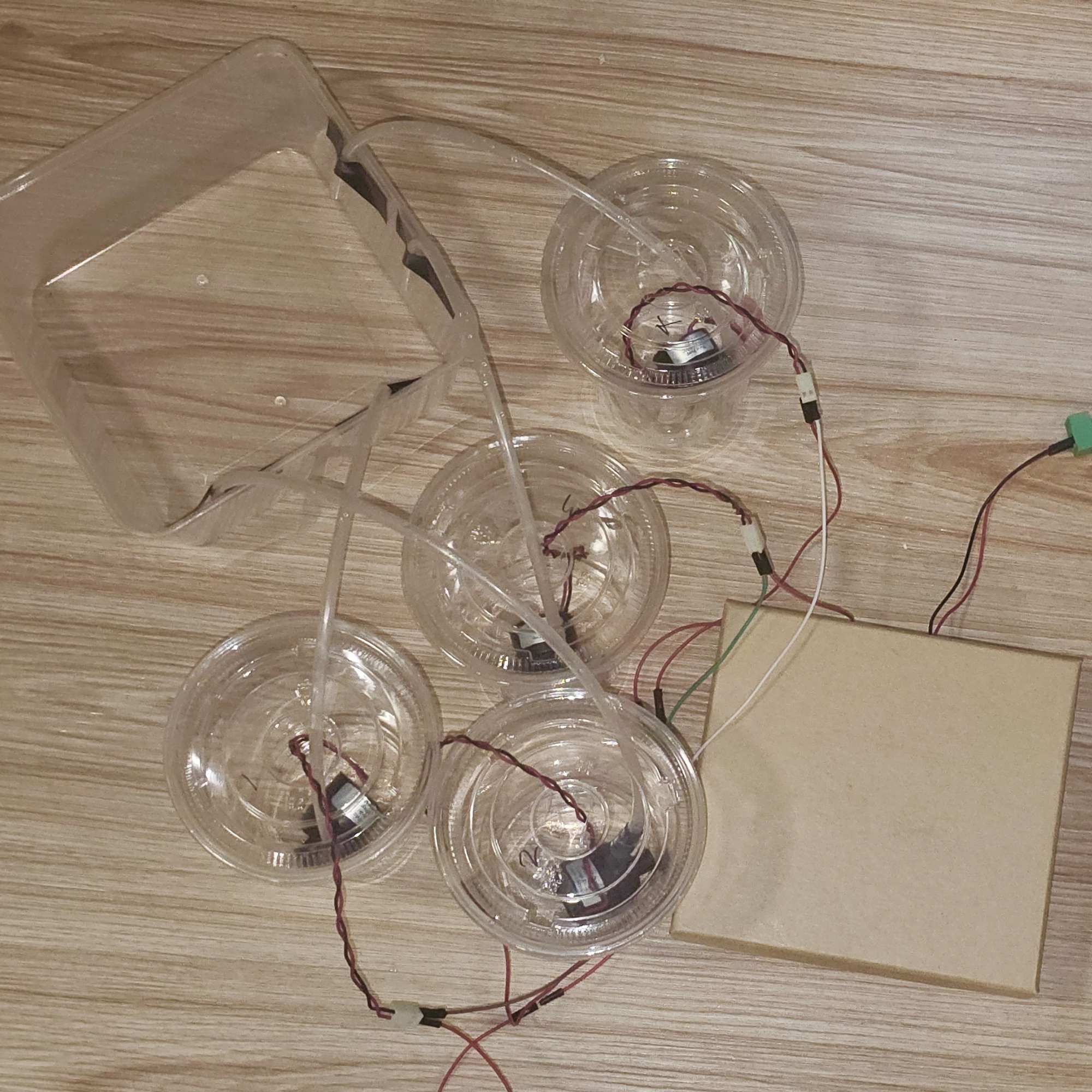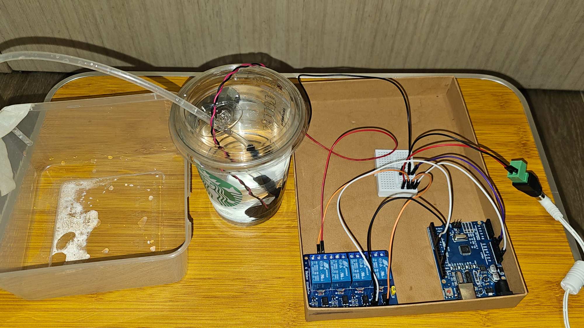 During the initial tests with a single pump, I discovered that the water continued to drip due to gravity when the paint container was too high. Aligning the container with the pump height solved this issue. Additionally, a 9V power supply proved insufficient unless the pump was fully submerged, which then allowed for proper operation.