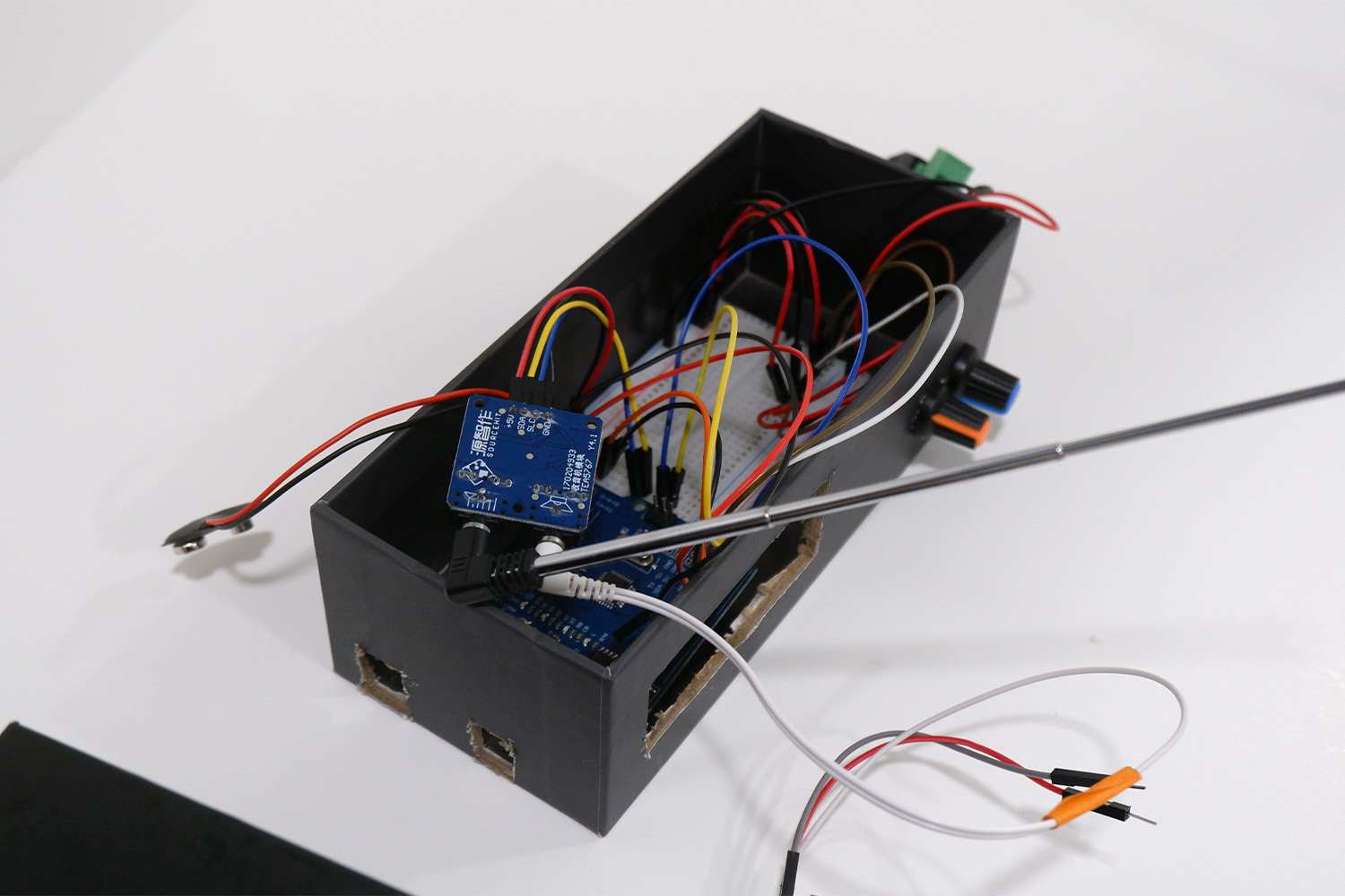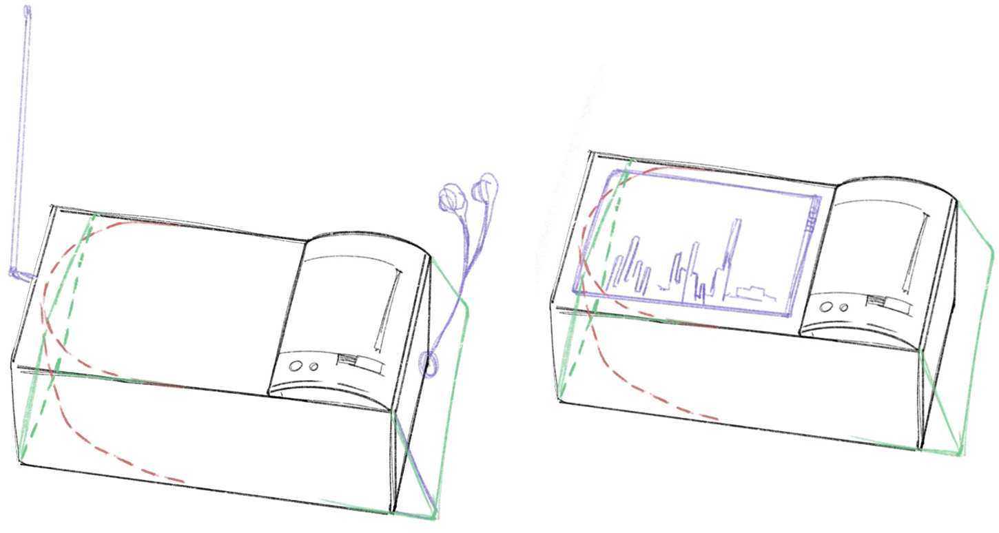 In these first iteration of prototypes, my priority was the technical functionality of the system rather than refining its form or aesthetic qualities. I tried adding the microcontroller, sensors, and wiring into a practical container, or a simple box that allowed for stable wiring and minimal empty volume. While I did create sketches to guide measurements and determine areas to cut for fitting components, these decisions were driven primarily by practicality rather than specific design considerations.