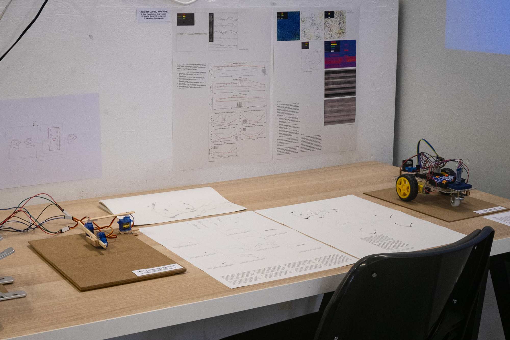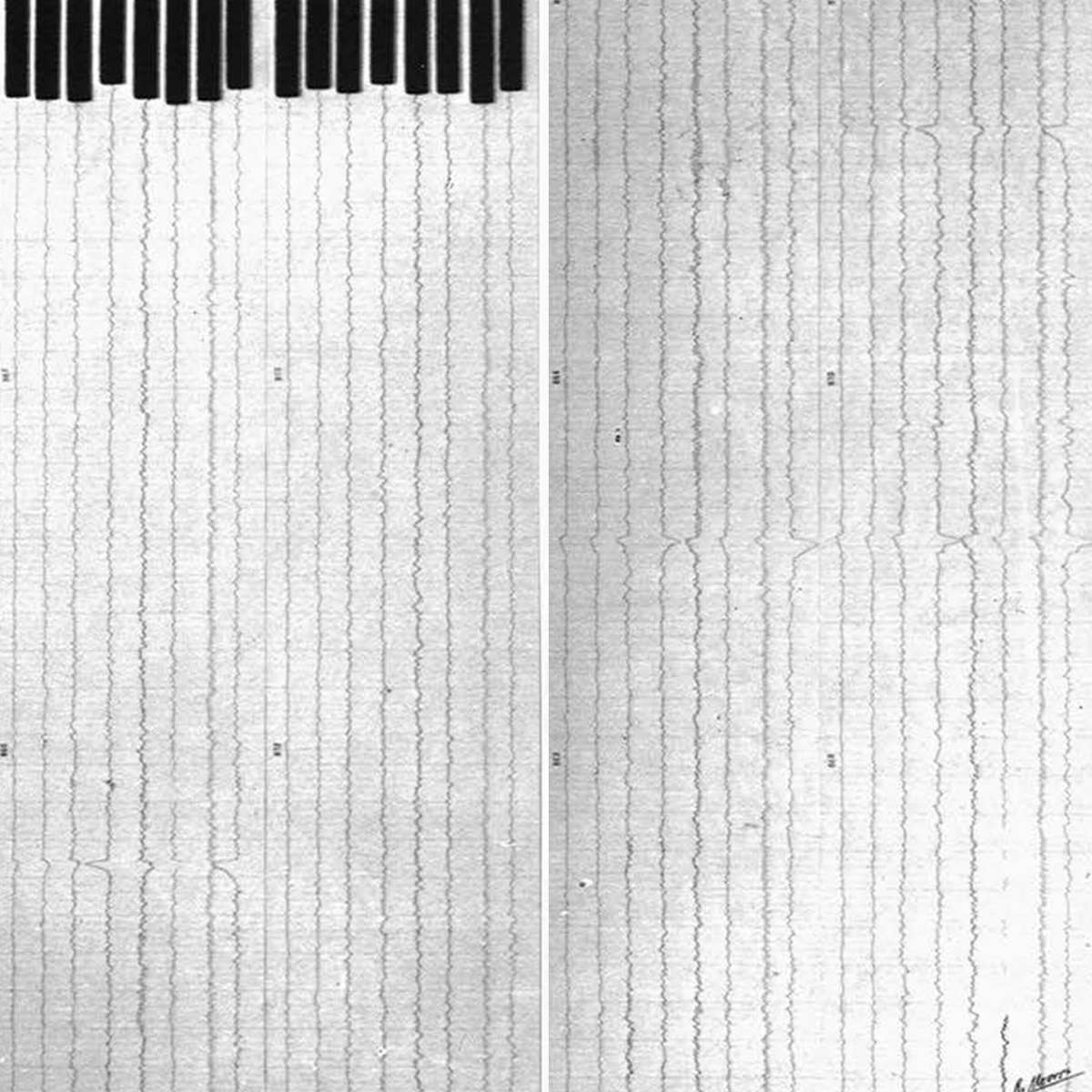 In the 1960s, artists like Robert Morris began using medical technologies like EEG to use physiological data for art making. Morris's Untitled (Hook, Track, Memory Dents), created in 1963, used EEG to monitor various brain regions, transforming these readings into visual forms that acted as a unique self-portrait. He connected this physiological data directly to the artistic process, reflecting on his cognitive states as the tracing needle marked the distance equal to his height.