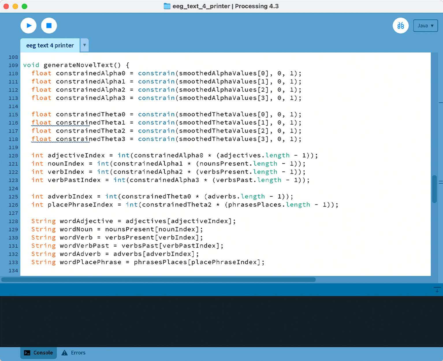 Then, I "constrained" each of the brainwave channel’s value to fit within a range of 0 to 1, making it easier to work with. These values are then multiplied by the length of a word category list to select a specific word. For example, if an alpha channel is 0, it will select the first adjective from the list, whereas a lower value would select one further down.