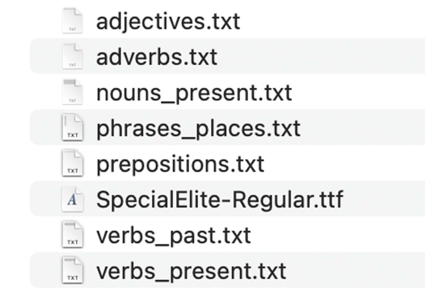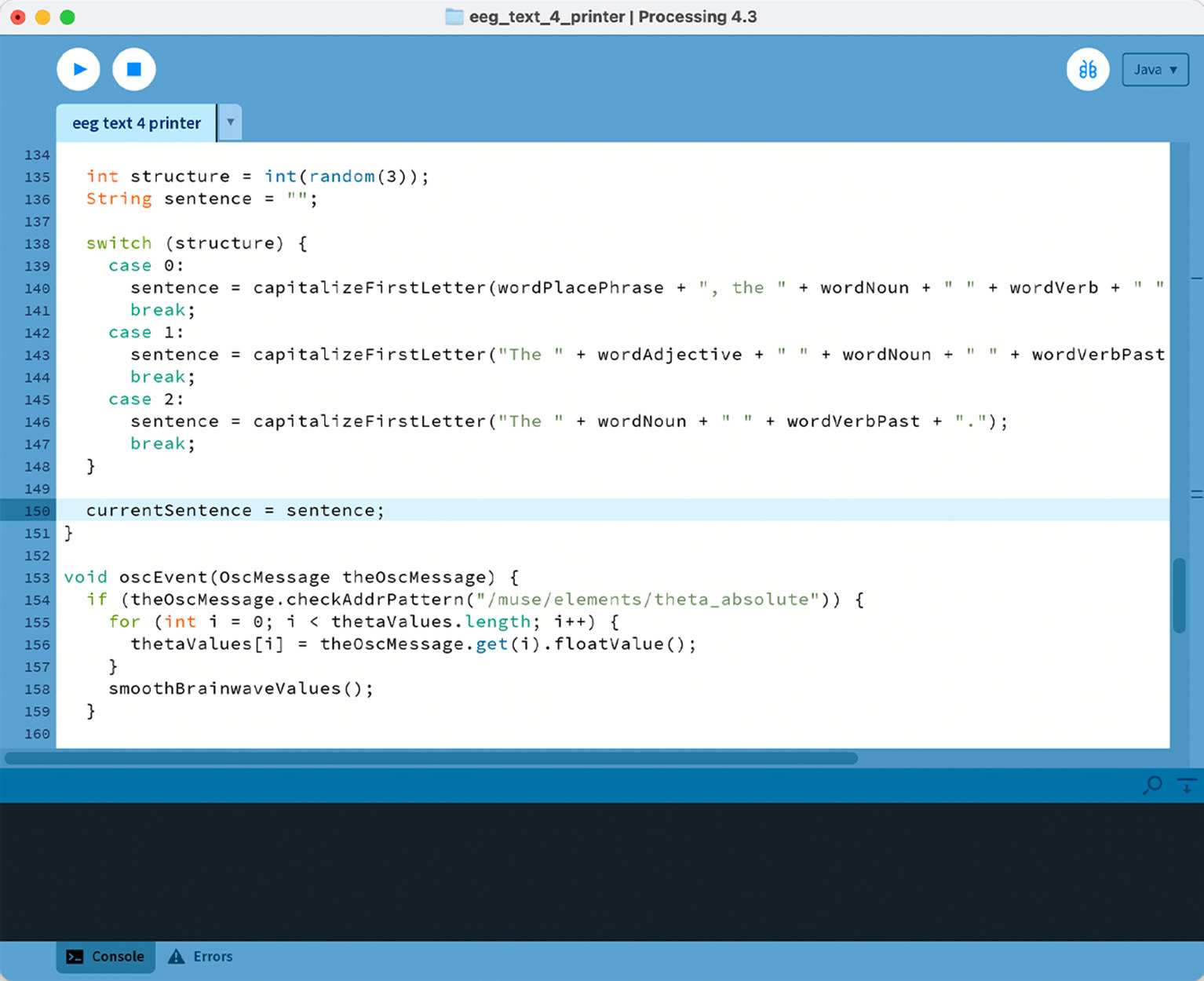 For the grammar, I divided the index into specific word lists: adjectives, nouns, verbs, adverbs, prepositions, and phrases related to places. These words were stored in arrays and loaded from text files so I can map specific brainwave values to different words.