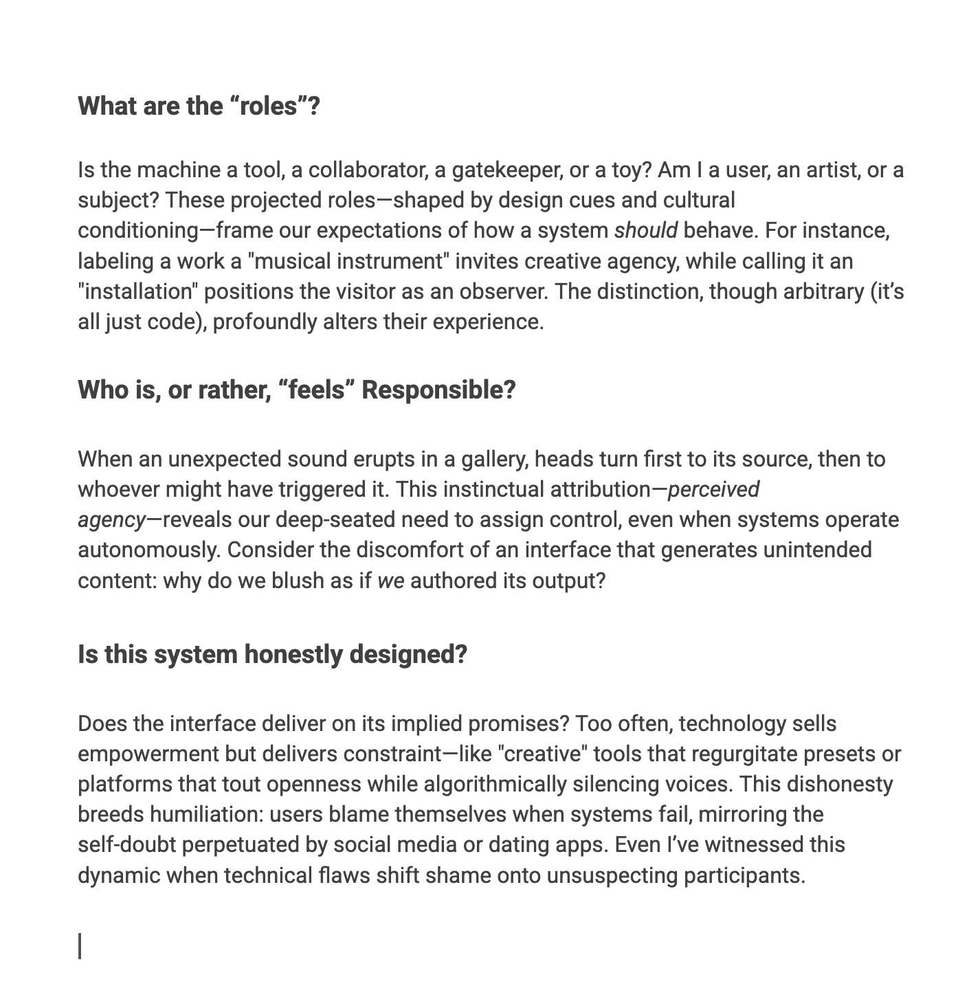As I finalise my project, I'm committed to honesty in design—not as a moral absolute, but as a guard against the alienation embedded in so much technology. When systems obscure their limits or manipulate agency, they don't just frustrate; they erode trust. The challenge is to create interfaces that acknowledge their own mechanics, allowing users to engage with clarity rather than conjecture. In a world where technology increasingly mediates our relationships, politics, and self-worth, this transparency feels not just artistic, but urgent.