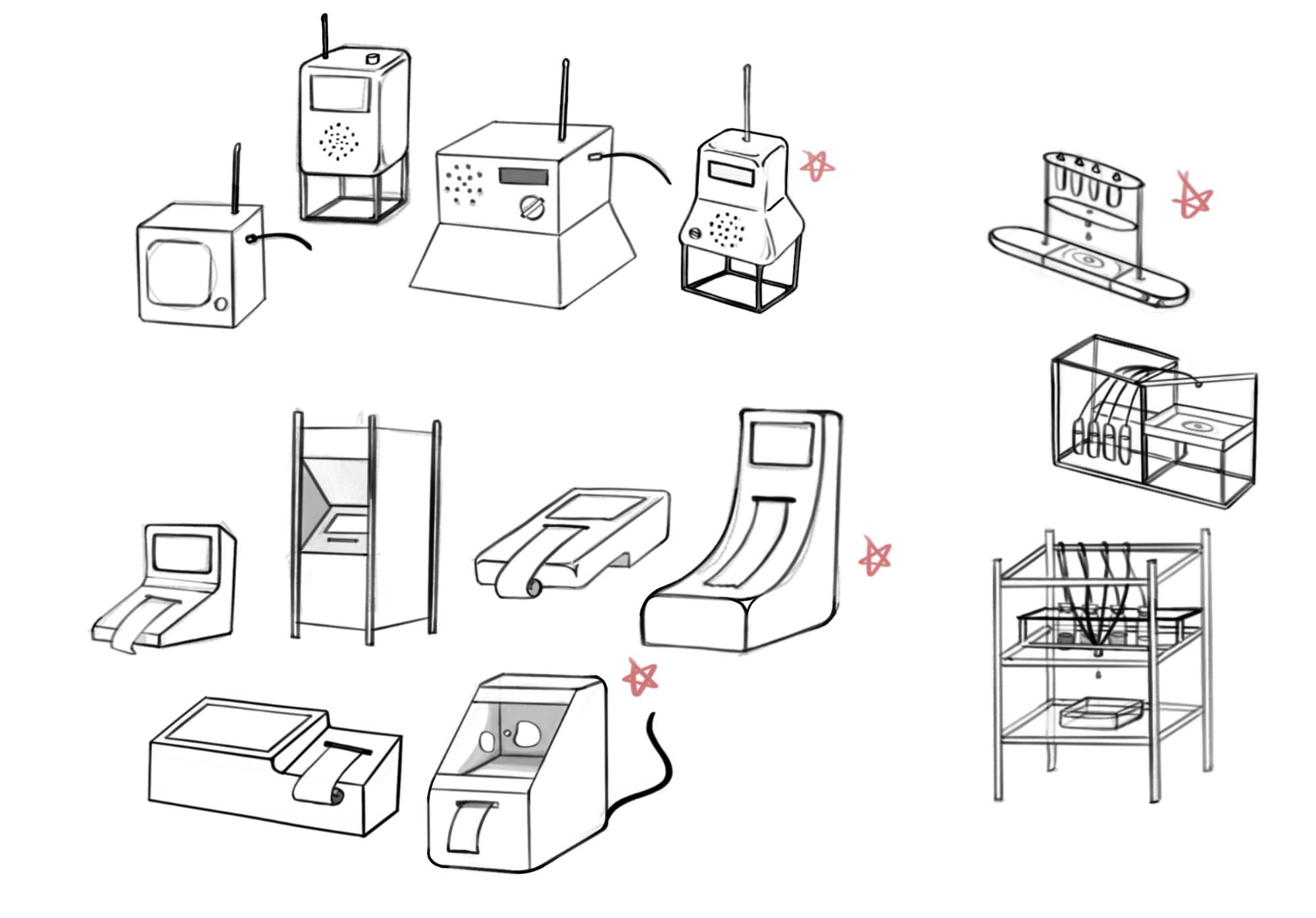 When I started sketching the radio interface, I took a freeform approach, guided by intuition rather than any strict principles. Rounded corners quickly became a recurring feature, reflecting rounded corners of the borders for images in my website and project collaterals. It also meant to avoid sharp, clean lines in favour of a vintage, 20th century computer-inspired look that complemented my project's visual identity. To make sure I was on the right track, I shared my sketches with peers, asking them to pick the most appealing designs. Even though I have some assumptions, getting grounded comments from the perspective of the user always helps priorities the considerations.