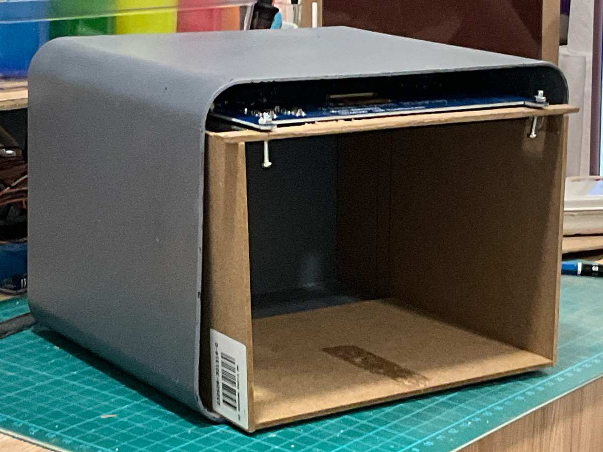 Picking up from where I left off last week. I mentioned that I was printing the inner structure. As such, I was planning to use a 3D-printed frame to create the upper structure. I then chose a suitably sized plastic box from a discount store and used a glue gun and wood putty to fill in any gaps, primed it with gesso, and so on. However, once the 7-inch screen arrived and I mounted it, it no longer fit inside the box—so I scrapped the 3D print. I decided to build the inner structure out of foam board instead.
