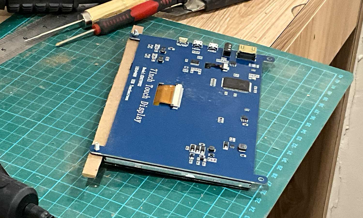 The screen has two screw holes each on the top and bottom. I cut the MDF board longer than the screen's width so I could fasten the screws there and then rest the board across the two vertical supports.