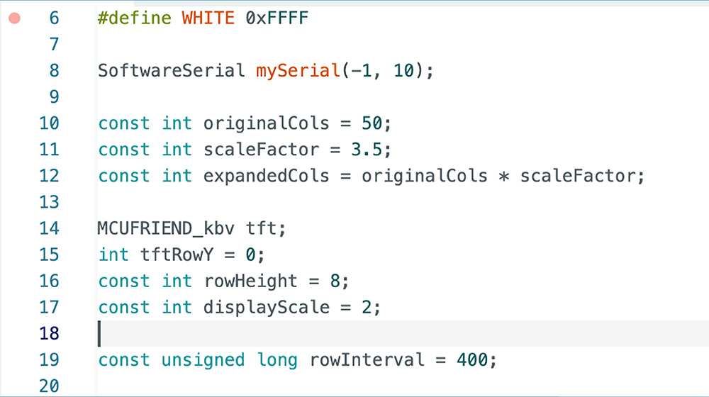 To execute this (connect the digital visualisation with a physical output), I used serial communication to send each new row—as a string of 0s and 1s—to an Arduino-controlled thermal printer. On the Arduino, a sketch listens for incoming serial data and prints each line immediately.