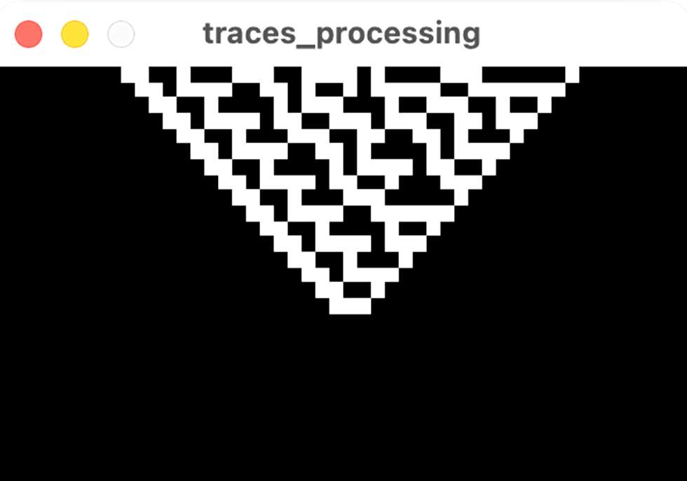 A new CA row is computed every 250 milliseconds and inserted at the top of a scrolling bitmap. As new rows appear, older ones shift downward until they disappear at the bottom, as a real-time representation of the evolution.The disappeared patterns are printed onto the thermal paper, creating a continuous scroll of patters.
