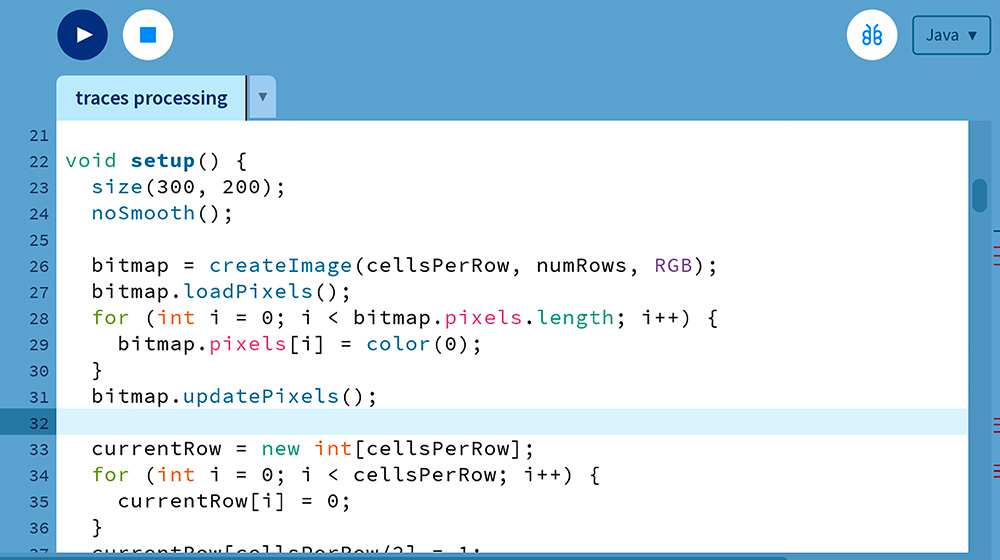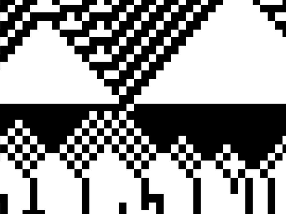 In terms of the coding, I used cellular automata to generate bitmap patterns because it's a straightforward way to simulate complex, evolving behaviour using simple rules. I set the rule to Rule 30, for its iconic and varied patterns, though this rule can be changed later on.