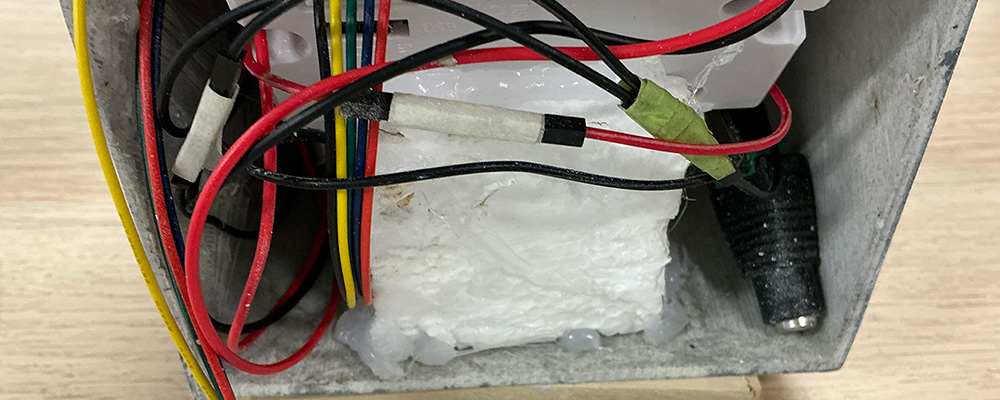 After placing the structure into the box, I checked where the holes for the HDMI and 8-pin connectors should go. I used a soldering iron to melt holes in the box and then a grinder to smooth the edges. I plan to secure the inner box with a glue gun and Styrofoam, then 3D print the front panel and fasten it in place.