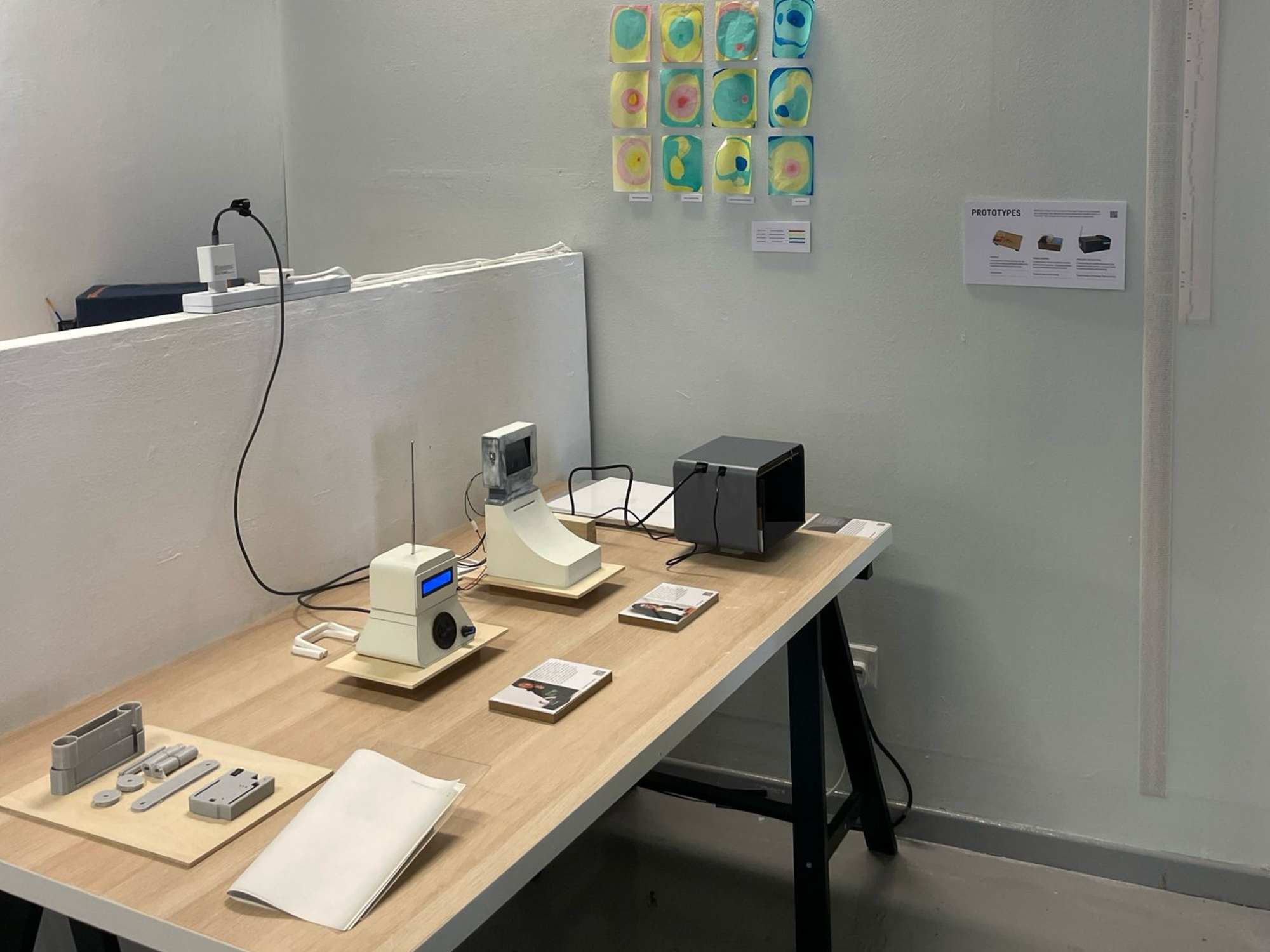 For a sort of mid-term review, my peers and I were to setup a table presenting the outcomes from term 1 (I joked that we could print out our dissertations and present that as the main item). My table was quite straight-forward. The three prototypes in progress and a simple booklet to show the interview results from artist Yeo Shih Yun. I also considered adding my graphic explorations to the table as prints, but just opted for a digital display on my laptop since there weren't any good examples for how they might be applied in use.